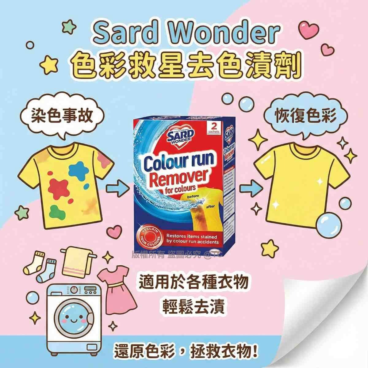 蛤?件衫又中咗「染色災難」🥶?唔使驚,有 ❤Sard Wonder 色彩救星❤ 幫手!專為有色衣物而設,夠溫柔唔傷布料,輕輕鬆鬆去晒啲討人厭嘅染色痕跡,件衫即刻翻生,鮮靚過人!