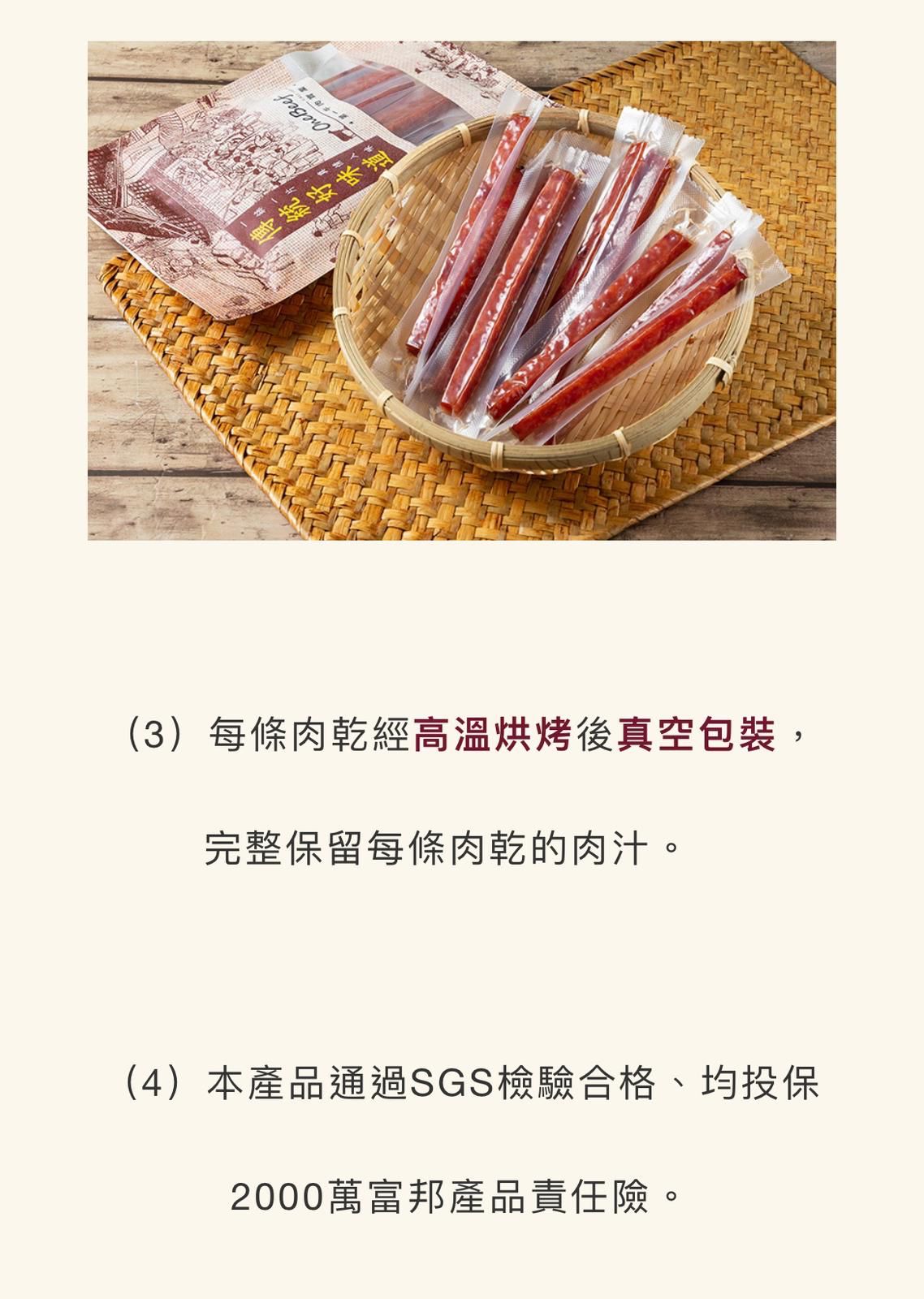 (3)每條肉乾經高溫烘烤後真空包裝,完整保留每條肉乾的肉汁。