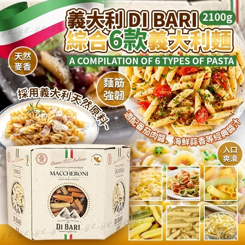 綜合組包含多款麵型:貓耳朵、螺旋麵、扭指麵、三色溝紋管麵、三色麵疙瘩、三色通心麵